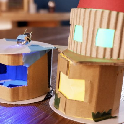 本日の幼児コースはPPテープで作ってみます。くるっとはねっかえったり、丸まったりしてなかなか癖のある素材。まず最初にホチキスで留める練習してからつくっていきます。