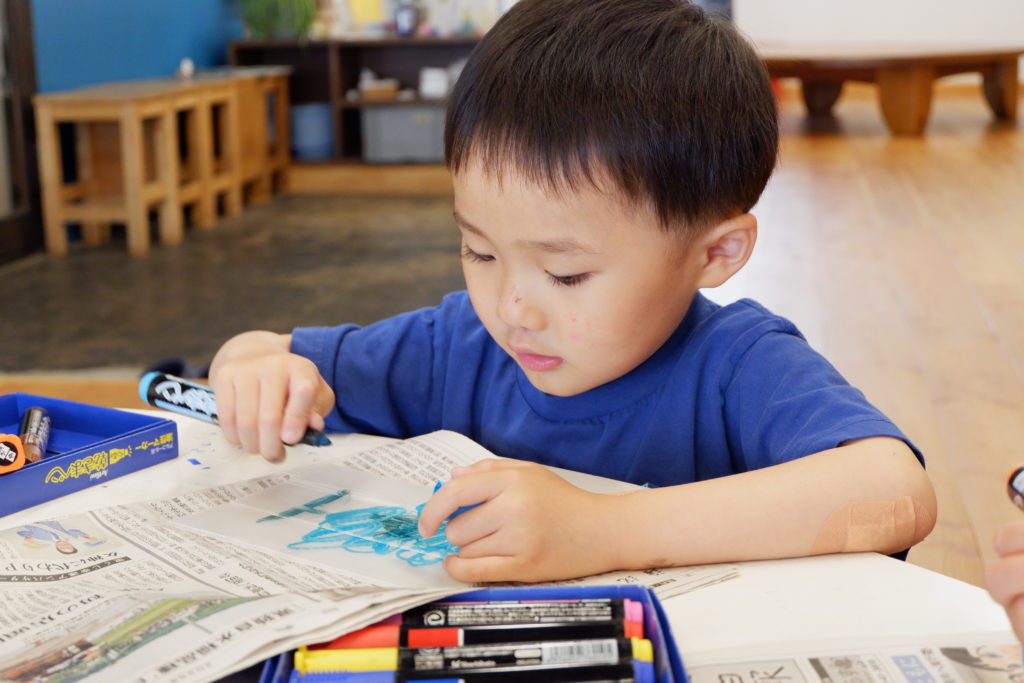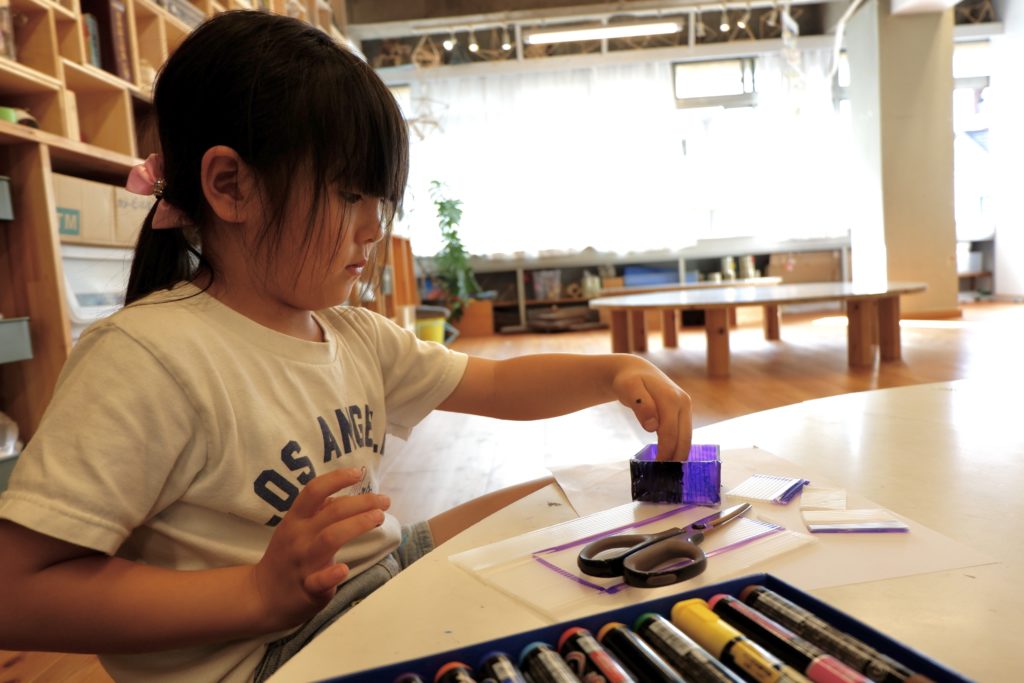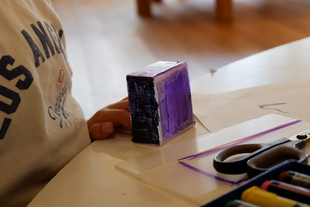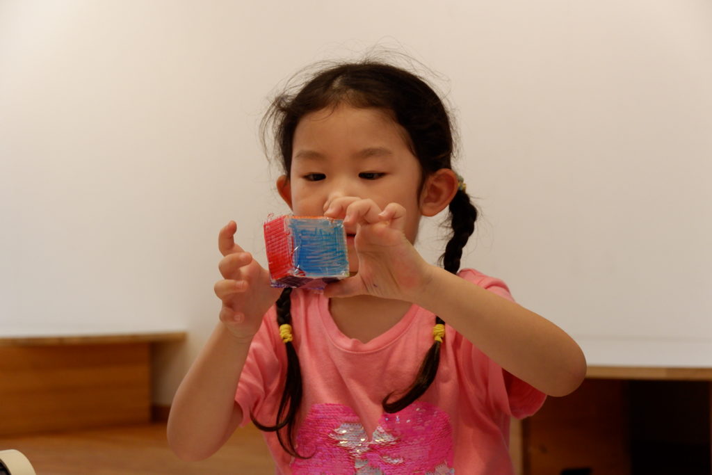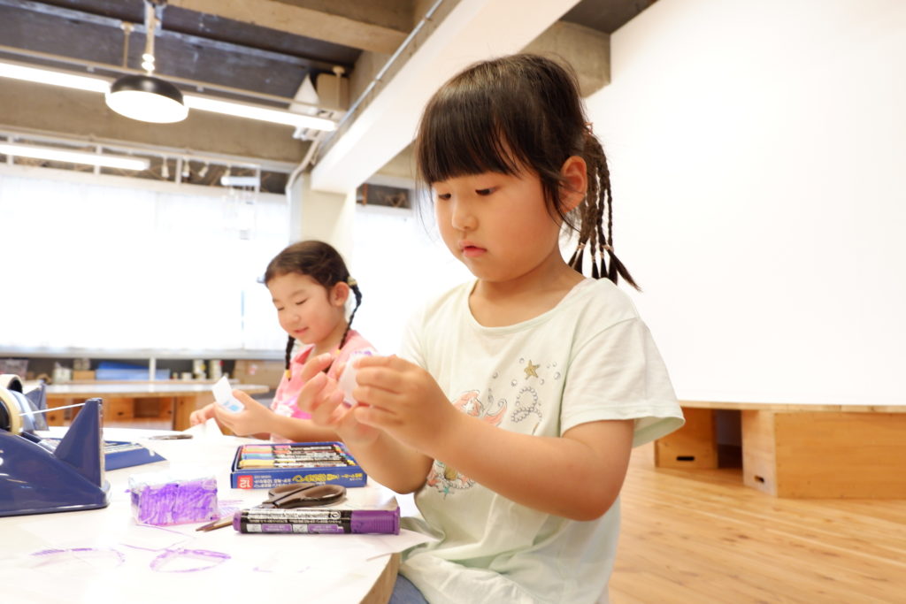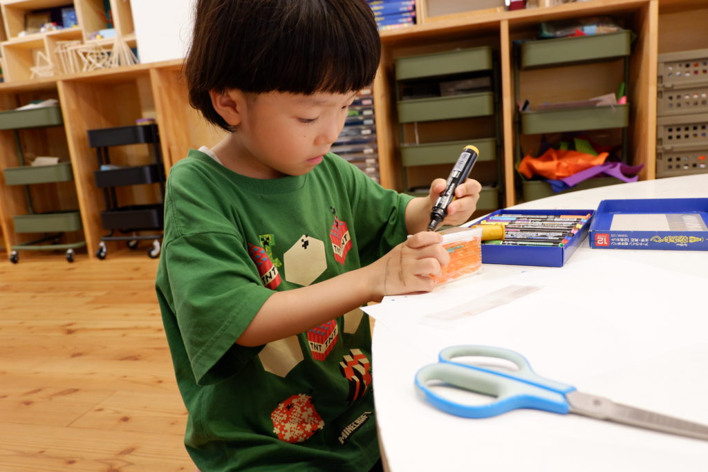 こちらの幼児コースは、プラスチックダンボールで作る立体物。プラスチックダンボールのなみなみを利用するとしっかり角を折ることができるので、底の形に合わせてなみなみ壁面部分をセロハンテープで貼っていくことで、簡単に立体物が作れます。