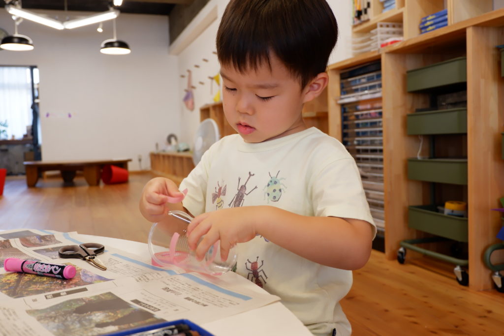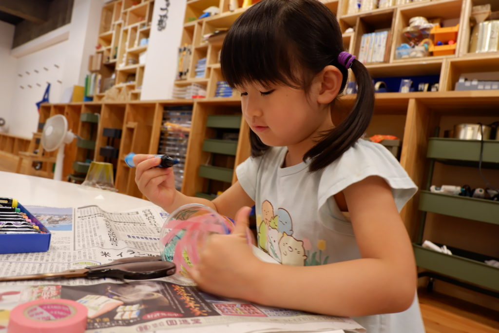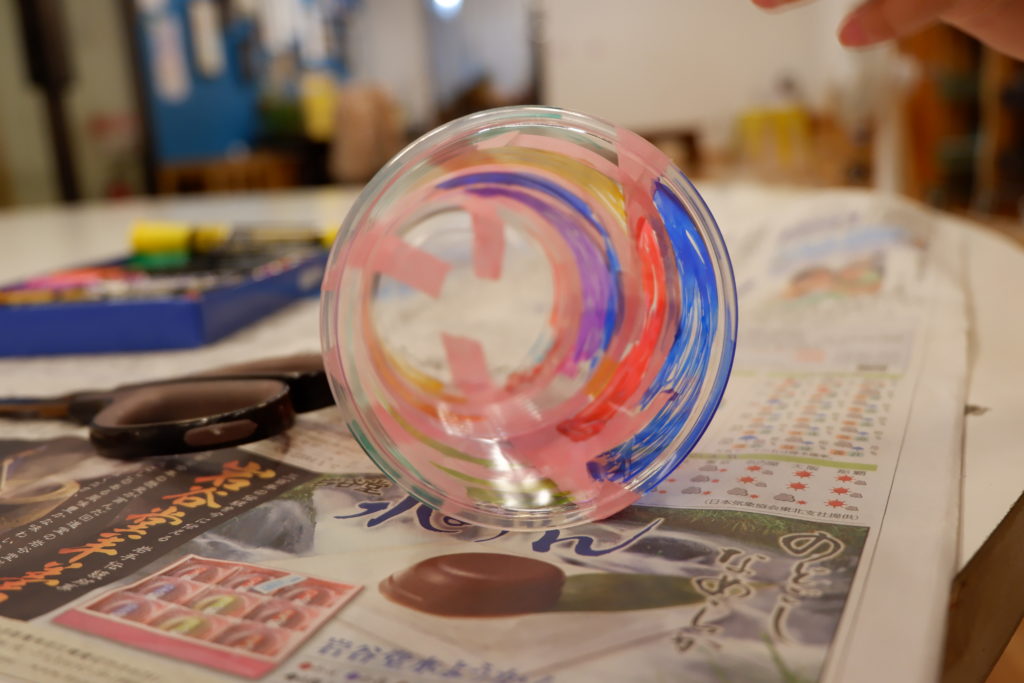 こちらの幼児コースは透明カップにマスキングテープで縁を作って、その中に油性ペンで色塗りをして、キラキラキレイなタワーをつくっていきます。