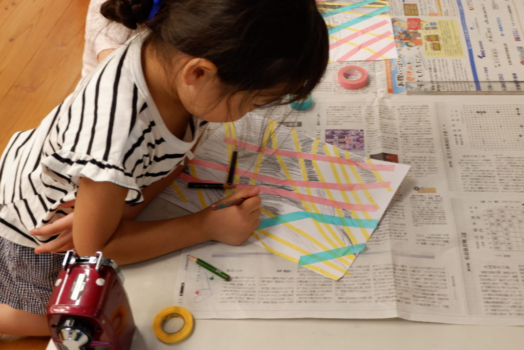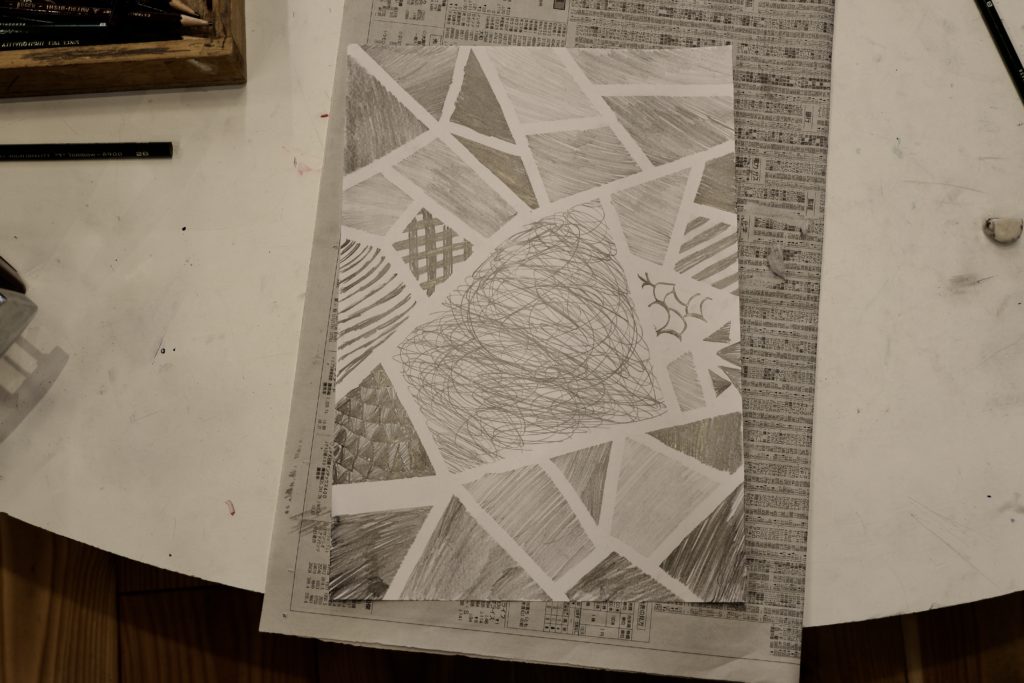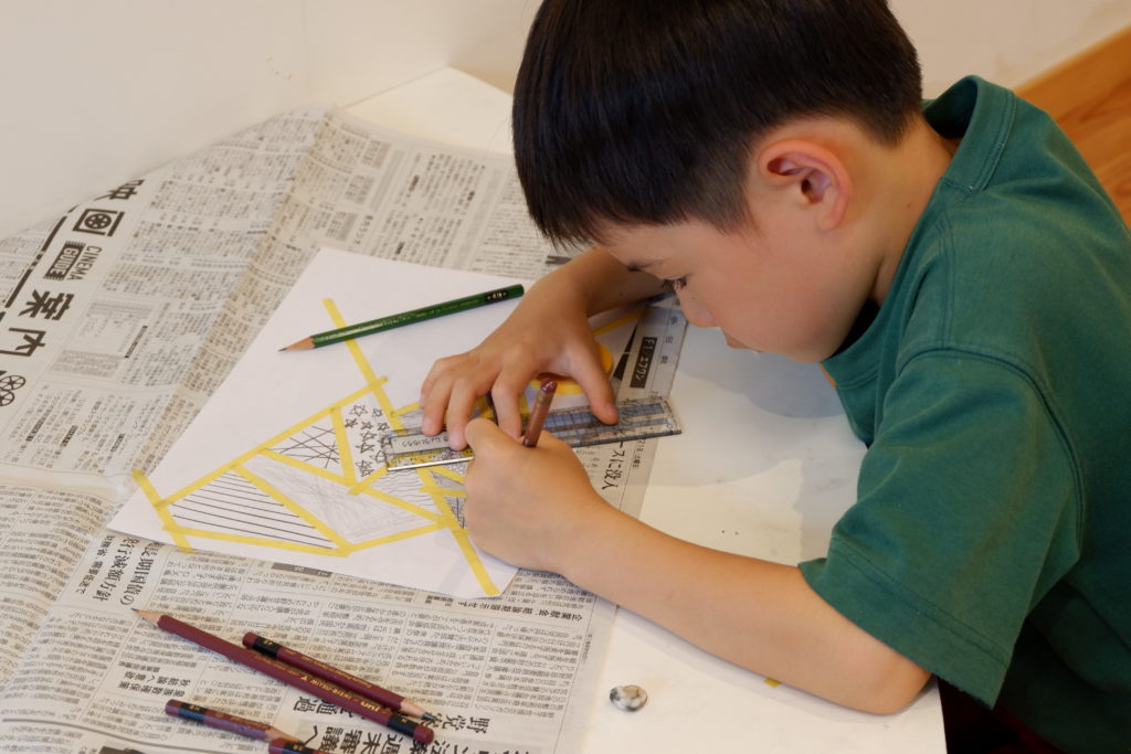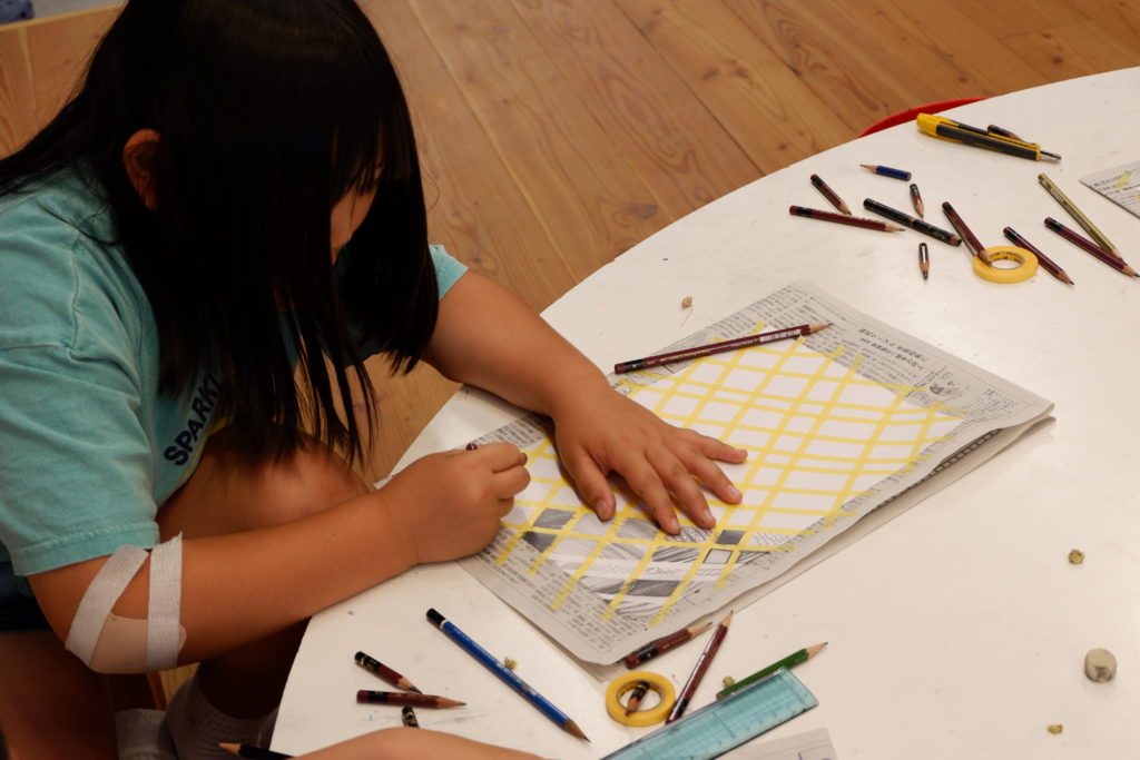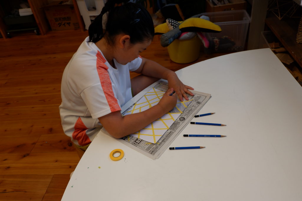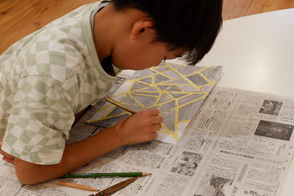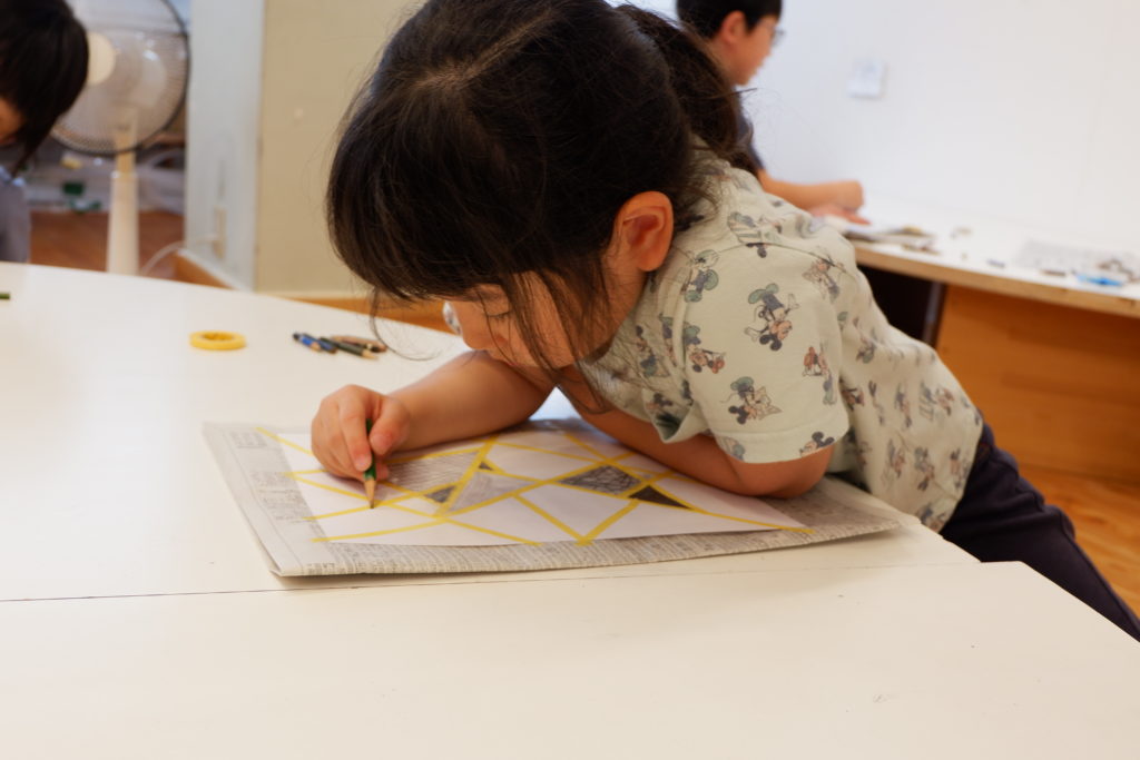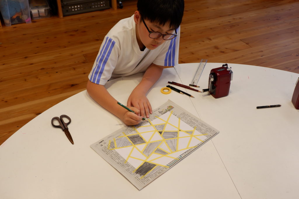 こちらの小学生コースは、マスキング白黒塗り絵。ケント紙に太さ様々なマスキングテープをあらかじめ貼って区分けをして、その間をいろいろな濃さの鉛筆や模様をそれぞれ描き分けていきます。