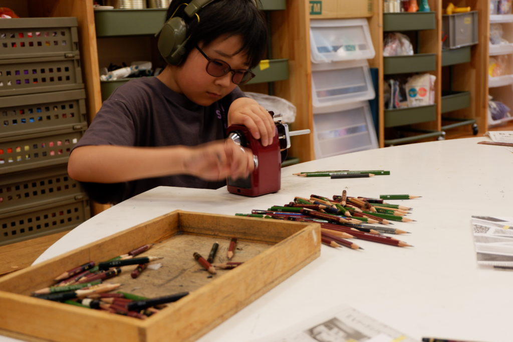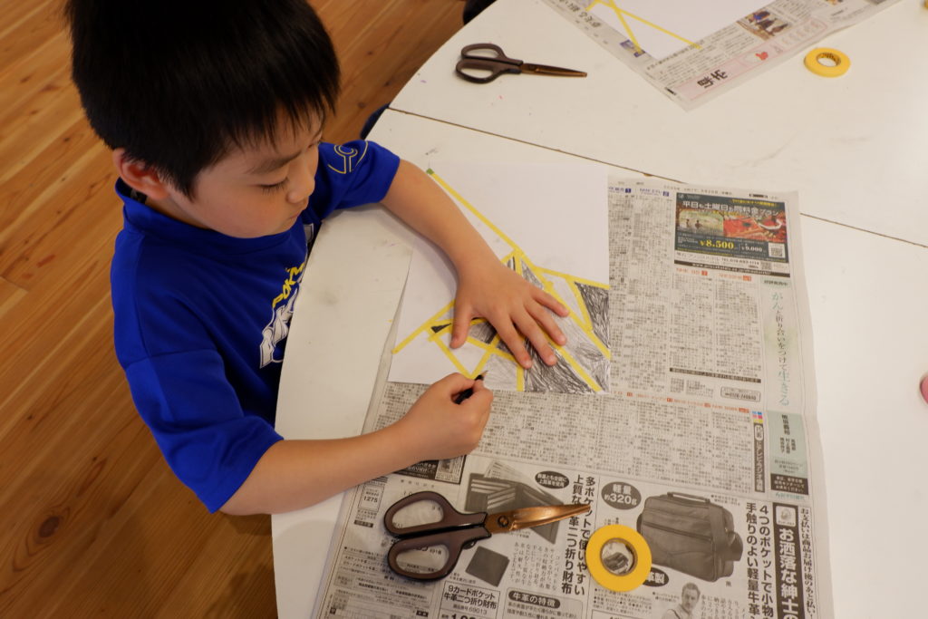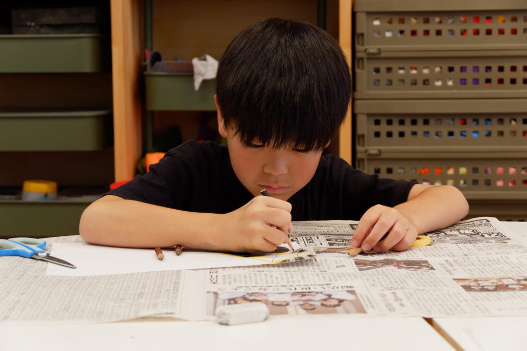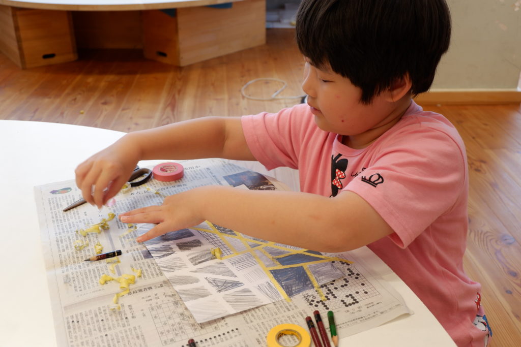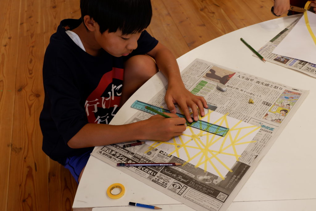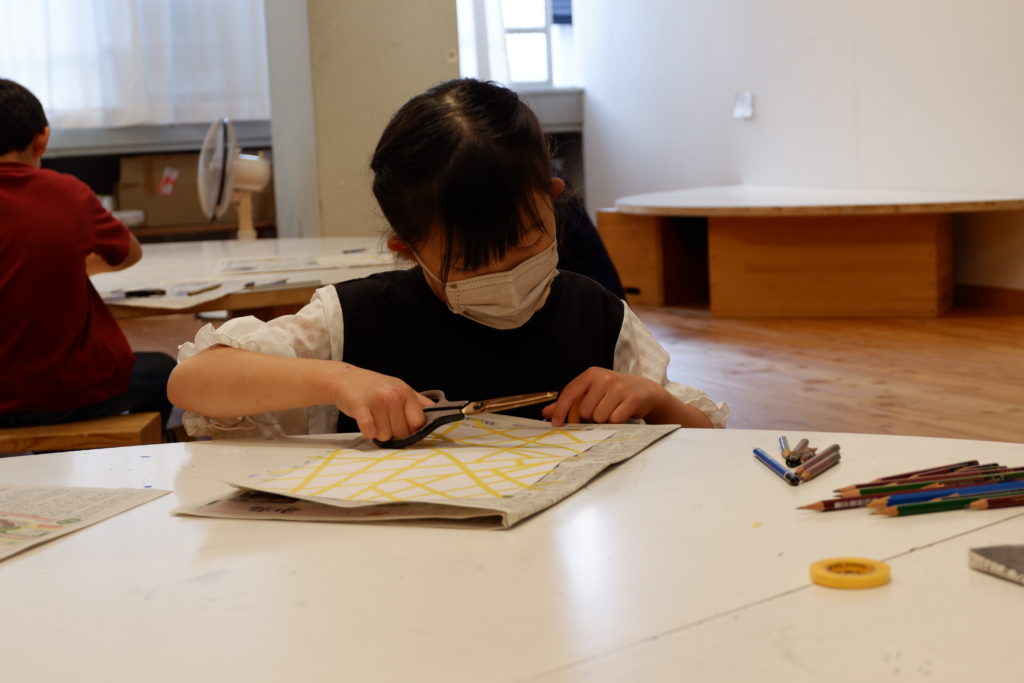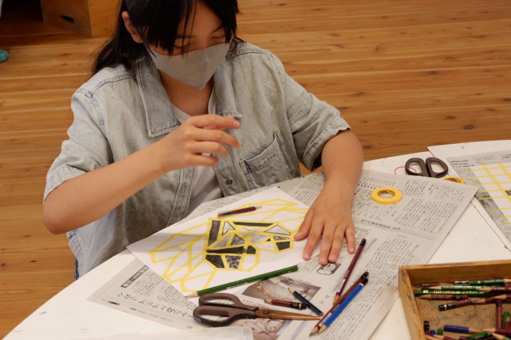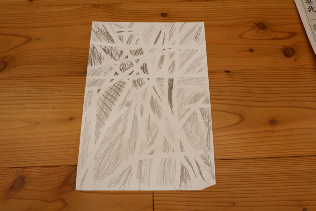 こちらの小学生コースは、マスキング白黒塗り絵。ケント紙に太さ様々なマスキングテープをあらかじめ貼って区分けをして、その間をいろいろな濃さの鉛筆や模様をそれぞれ描き分けていきます。