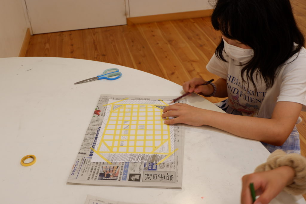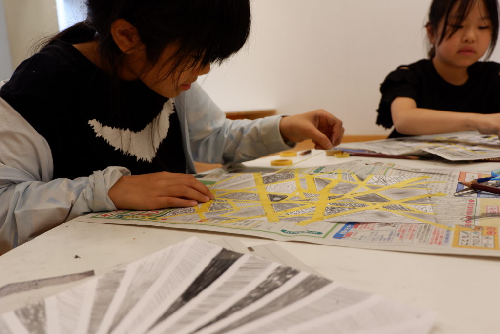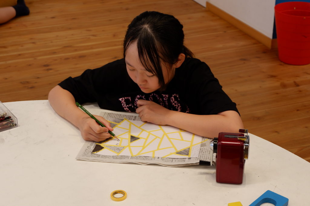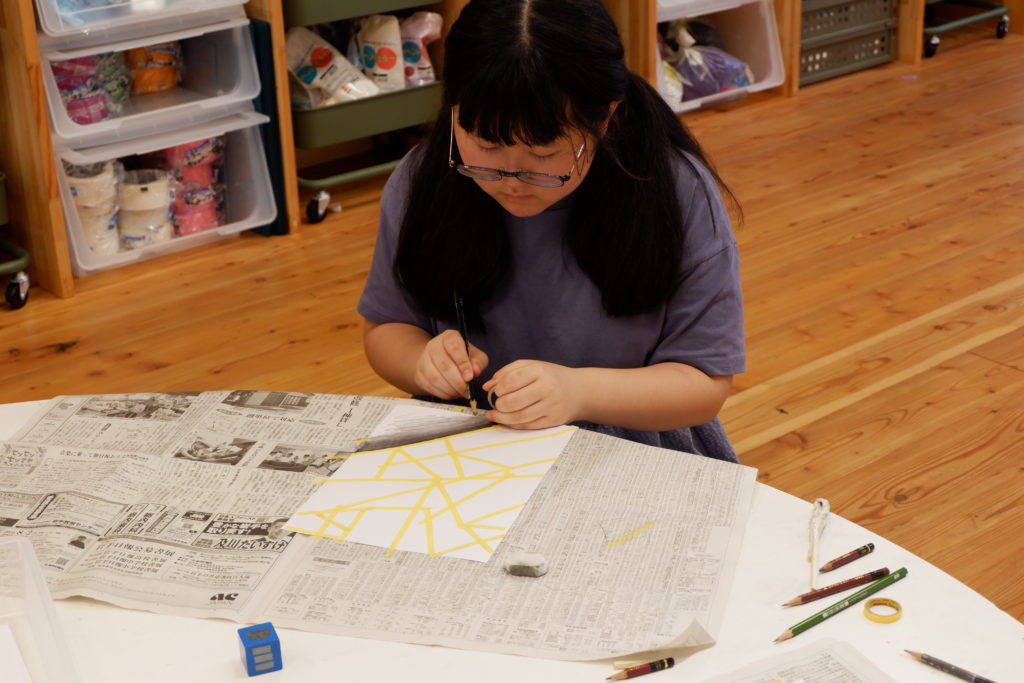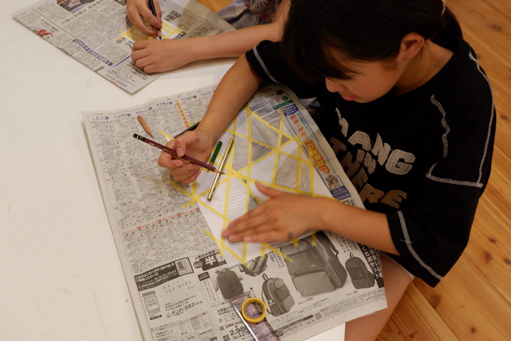 こちらの小学生コースは、マスキング白黒塗り絵。マスキングテープとの相性を考えて、今回は完成後スルッとテープが剥がれるケント紙を使って描いていきます。ケント紙なので、鉛筆の粉は乗りにくいのだけど、描いた筆致が浮き出やすかったりもします。