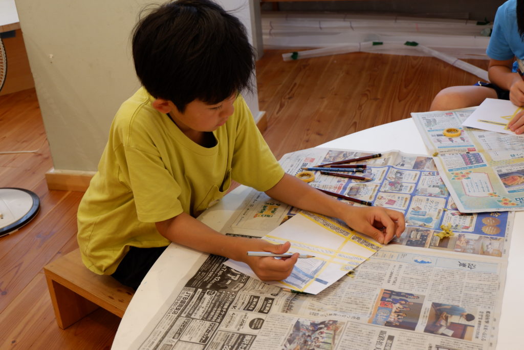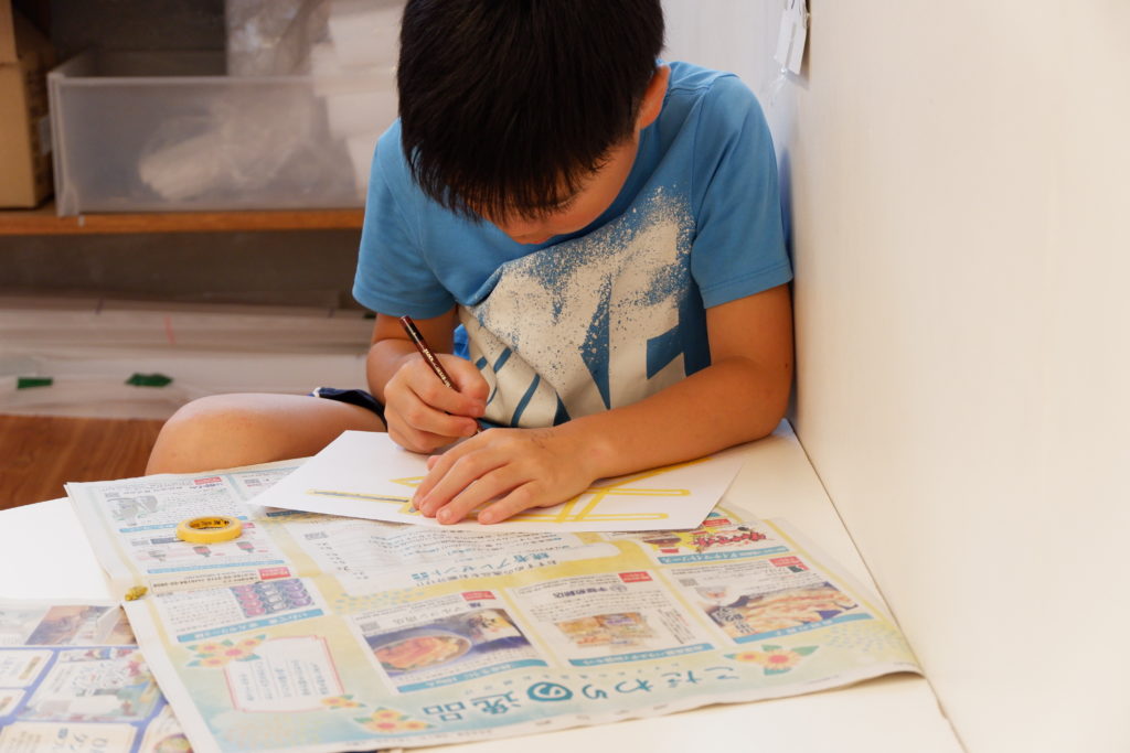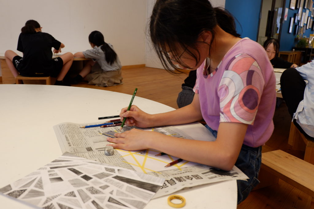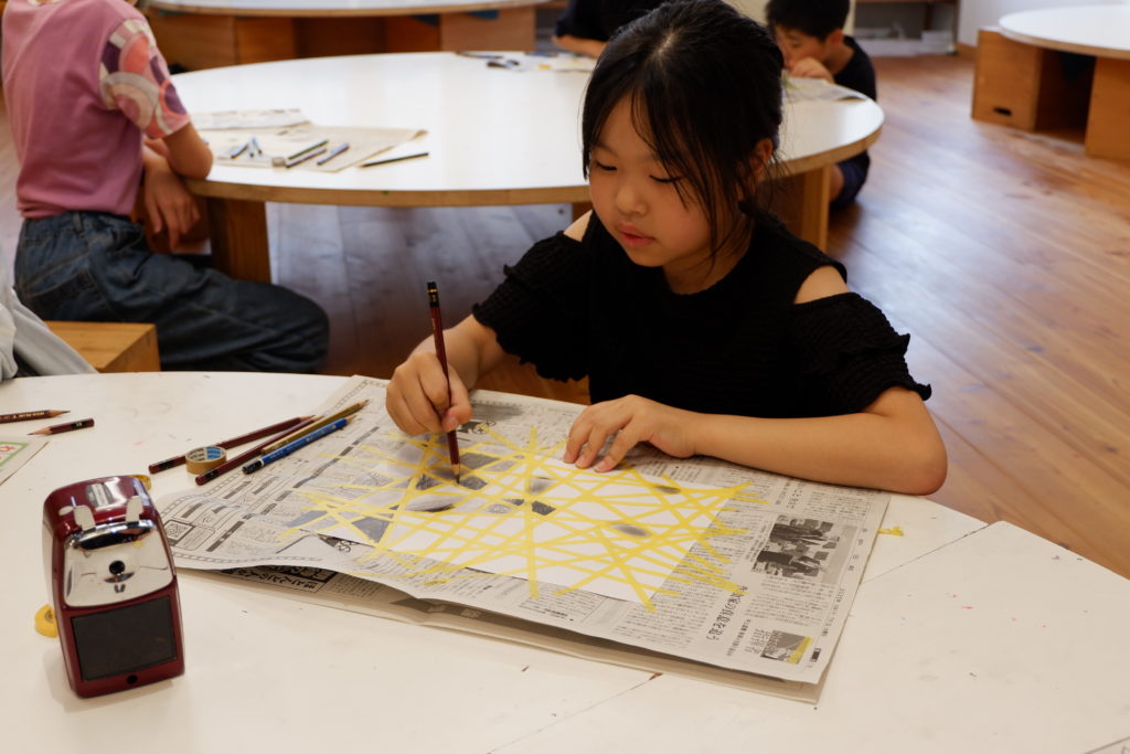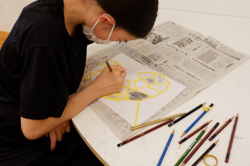 こちらの小学生コースは、マスキング白黒塗り絵。マスキングテープとの相性を考えて、今回は完成後スルッとテープが剥がれるケント紙を使って描いていきます。ケント紙なので、鉛筆の粉は乗りにくいのだけど、描いた筆致が浮き出やすかったりもします。
