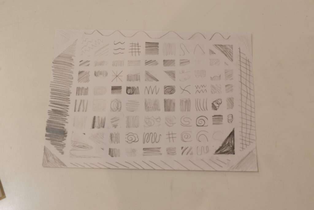 その紙の特性も活かしながら、いろいろな濃度、模様で画面を埋め尽くしていきます。テープがある時と剥がしたあとでやっぱり見え方が異なってきていい仕上がりになっています。